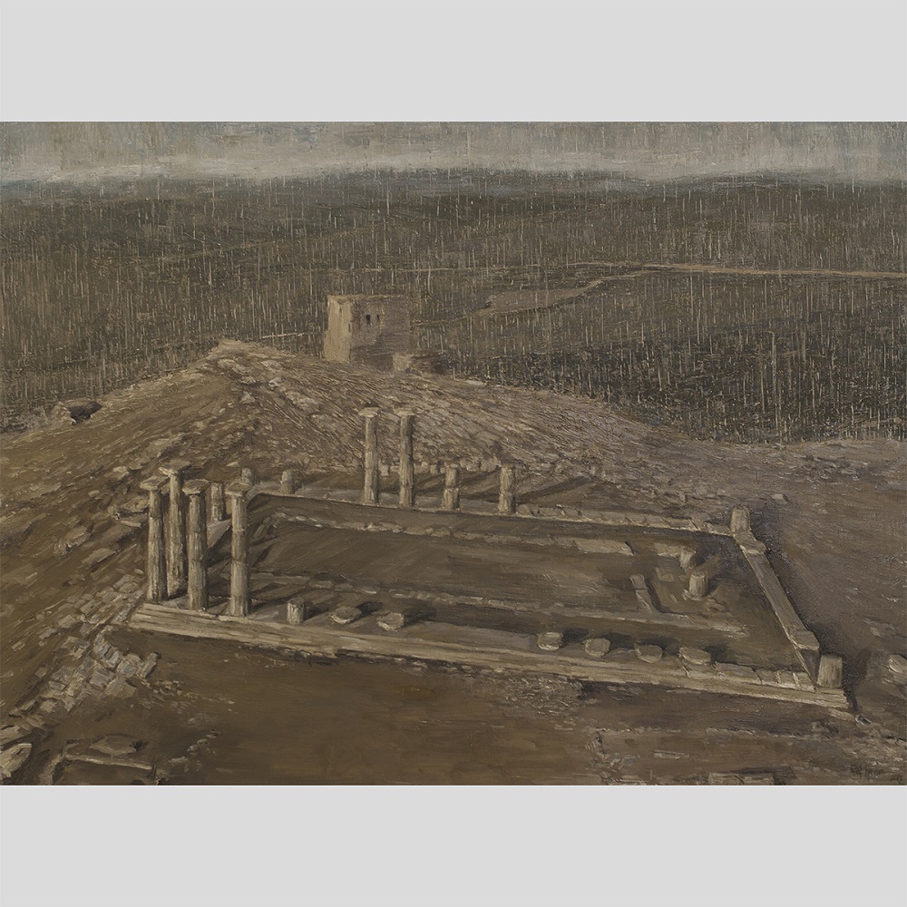 Troya’nın dokuzuncu ve son yapı katmanında yer alan Athena Tapınağı’nın  inşa tarihinin M.Ö.530 olduğu tahmin edilmektedir. Günümüze kadar etkilerini sürdürebilen tapınağın bulunduğu yer özenle seçilmiş, surların yapımından sonra, çevresine hakim bir noktada kurularak, Athena’ya ithaf edilmiştir.  Kentin koruyucusu olan Athena, Troya savaşı kahramanlarının da koruyucu Tanrıçası olmuştur. “Athena Tapınağı” adlı resim, geçmişin izlerini bugüne taşırken, savaşın yıkımları ve zamanın alıp götürdükleriyle varlığını izleyiciye bir kez daha anımsatır.