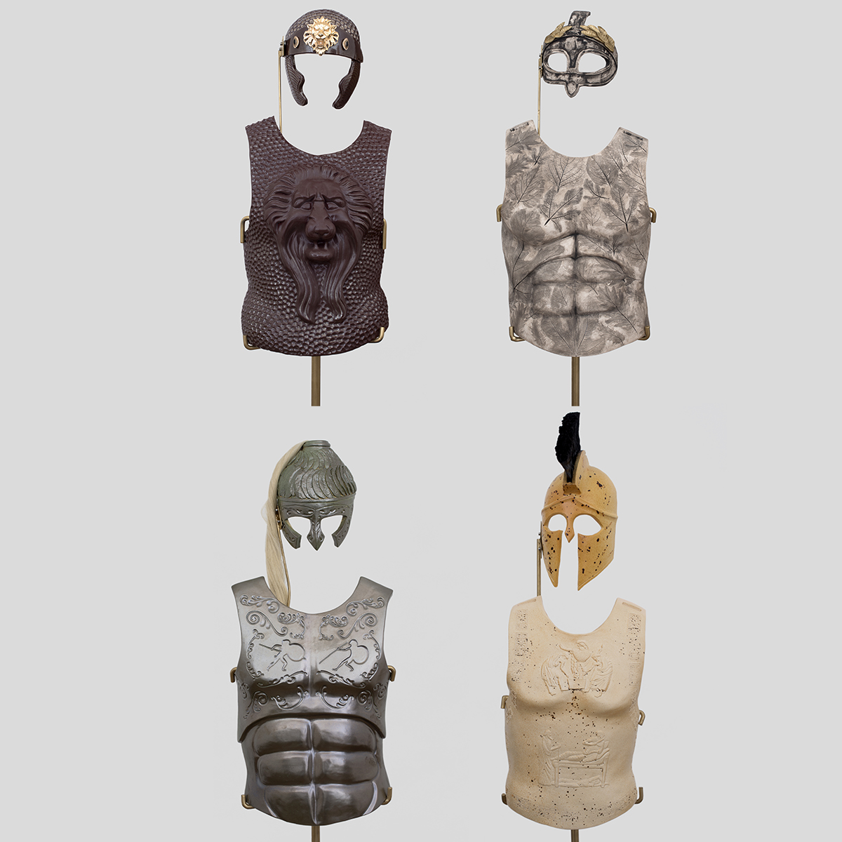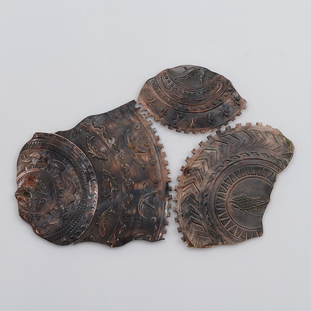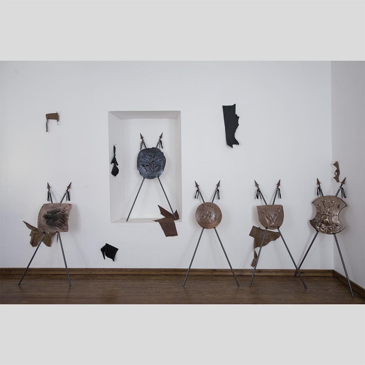 Troya savaşı gerçeklik ve mit arasında, güç, mücadele, cesaret ve zafer ile yıkım, acı, zayıflık ve trajedinin bileşimi olarak hayal gücü ve hafızaya ilham verir. Bu ilhamdan hareketle geleneksel-konvansiyonel üretim formuyla güncel yaratıcı yorumu ortaya çıkartan çalışmalardan “Troya Kalkanları”, Troya Savaşında çarpışan askerlerin kullandıkları savaş kalkanlarını temsil eder. Sembolik anlamlara sahip hayvan ve insan motifleri ile geometrik desen ve süslemeler, seramik yüzeyde rölyef (kabartma) formunda işlenmiştir.Üzerindeki desenlerin savaşa dair bir güç göstergesi olarak sembolize edildiği kalkanlar ve savaşçıların kıyafetlerinden/tenlerinden kopan parçaları temsil eden derilerle gerçekleştirilen düzenleme, savaşın verdiği yıkımı temsil eder.