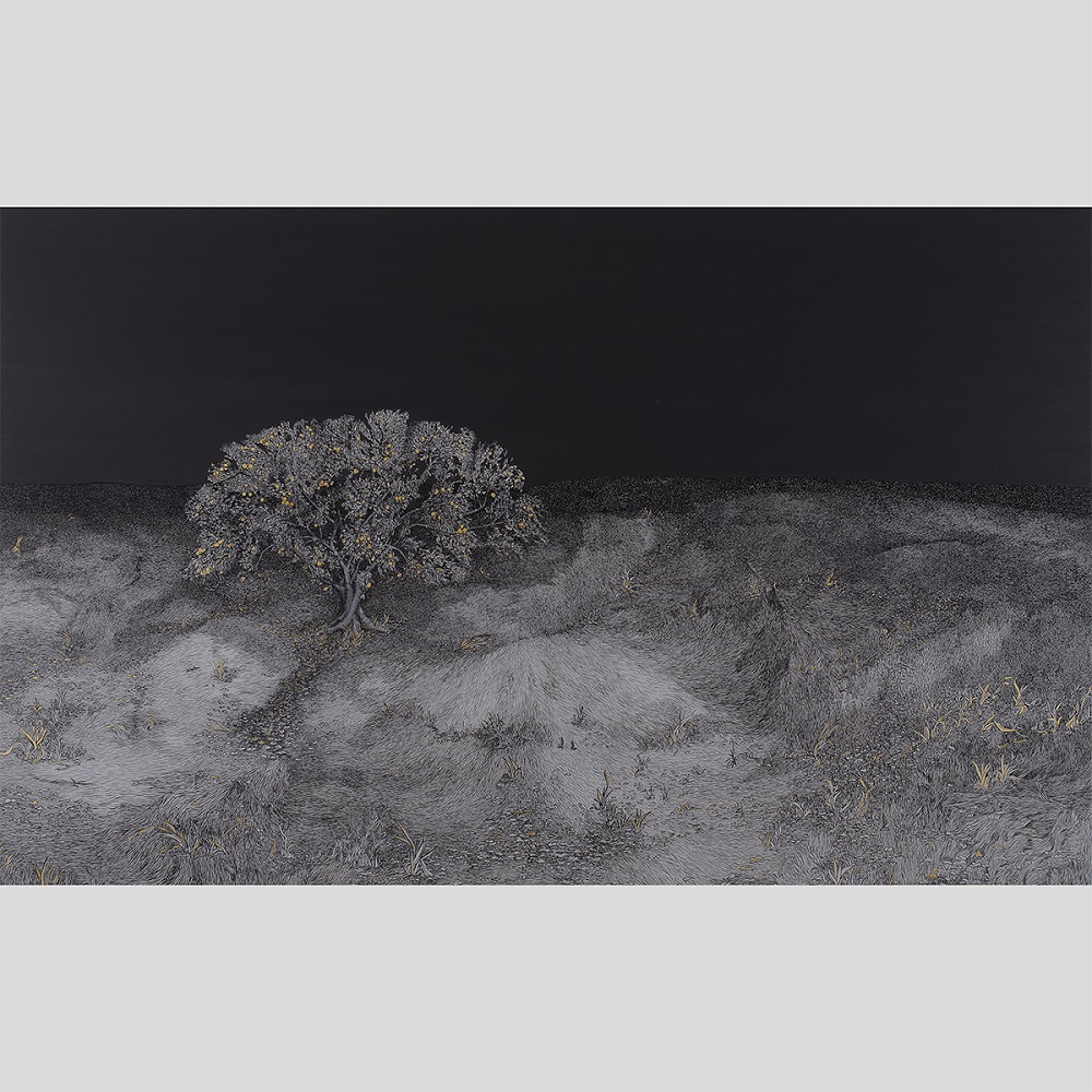 Kutsal metinlerde, mitolojide, halk hikayelerinde ve masallarda sıklıkla bahsi geçen “elma”, sonucu felaketlerle biten olayların başlamasına sebep olan bir sembol olarak çoğu anlatıda karşımıza çıkar. Elma, uyarıcı, merak uyandıran, çekici bir sembol olarak Troya savaşına neden olan olayların başlangıcı varsayılan 3 Güzeller efsanesinde de geçer. Elma metaforunu merkezine alan “Tohum” adlı çalışmada elma ağacı, dünyaya atılan kötücül bir tohumun yuvası olarak tasvir edilir. Ağaç ve çevresi altın bezemelerle parlayarak çekici bir görüntüyü sergilerken, bu alımlı görüntünün ardında kendi gerçeğini saklamaktadır. Tuval üzerine akrilik mürekkep kalemiyle üretilmiş bu resim, bilgelik, kötülük, merak, zaaf ve ödülün metaforu olarak Troya savaşını başlatan ölümcül bir tohumun meyvesini izleyiciye sunar.