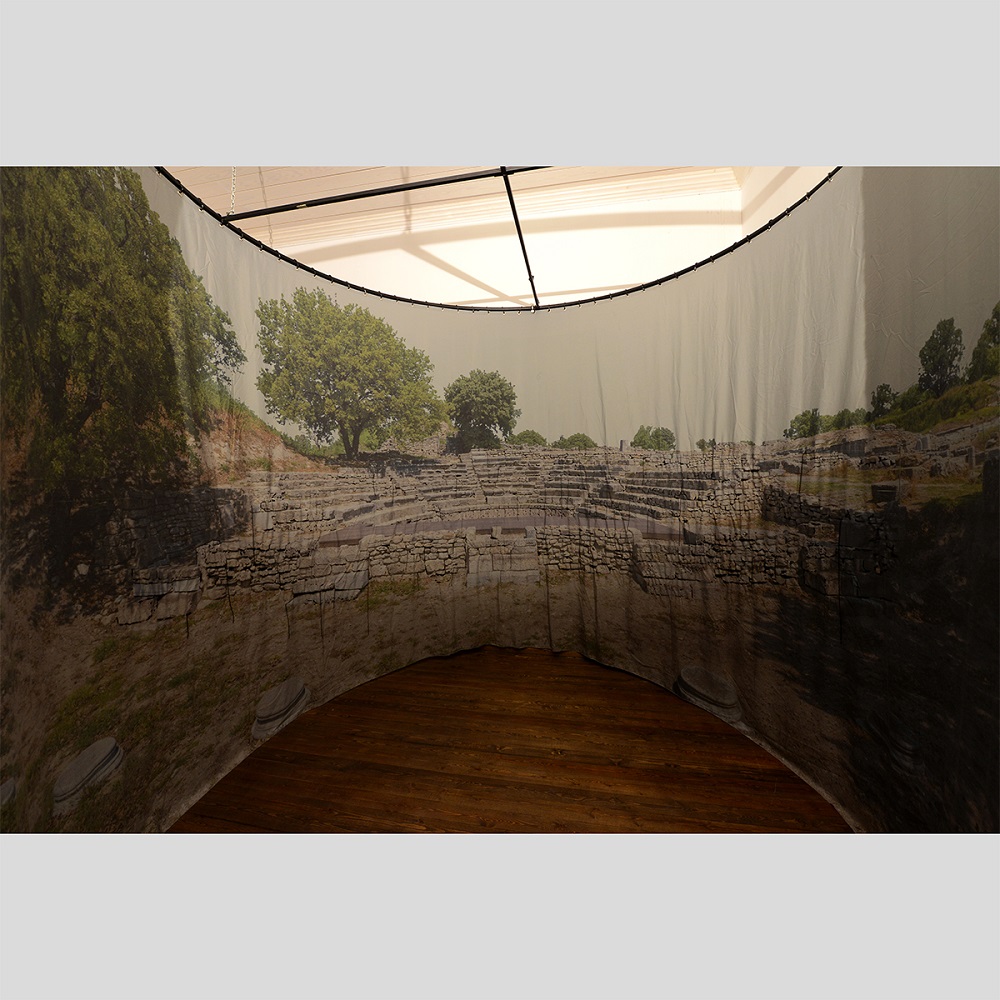 Troya, MÖ.3000’den MS. 500’lere kadar yerleşimin olduğu, 9 farklı kent katmanı ve 50’den fazla yapı evresinin tespit edildiği bir yerleşim yeridir. Homeros’un İlayda’sında asırlardır büyüleyen bu zenginlik, meşe ağaçlarının arasında günümüzde de varlığını büyük ölçüde sürdüren ve yaşamaya devam eden Amfi Tiyatro ile hayat bulur. 9 katmanlı kentin büyüsü sahnededir… Amfi Tiyatronun sistemli geometrik dizilimi ve tek renk algısı “Seyir” isimli seramik panoya esin kaynağı olur. “Seyir” içinde izleyiciyi ve oyunu barındıran yatay düzende üç boyutlu bir sahne olmaktan çok izleyicinin göz hizasında iki boyutlu olarak duvarda konumlanmış oyunun ana karakteridir artık.