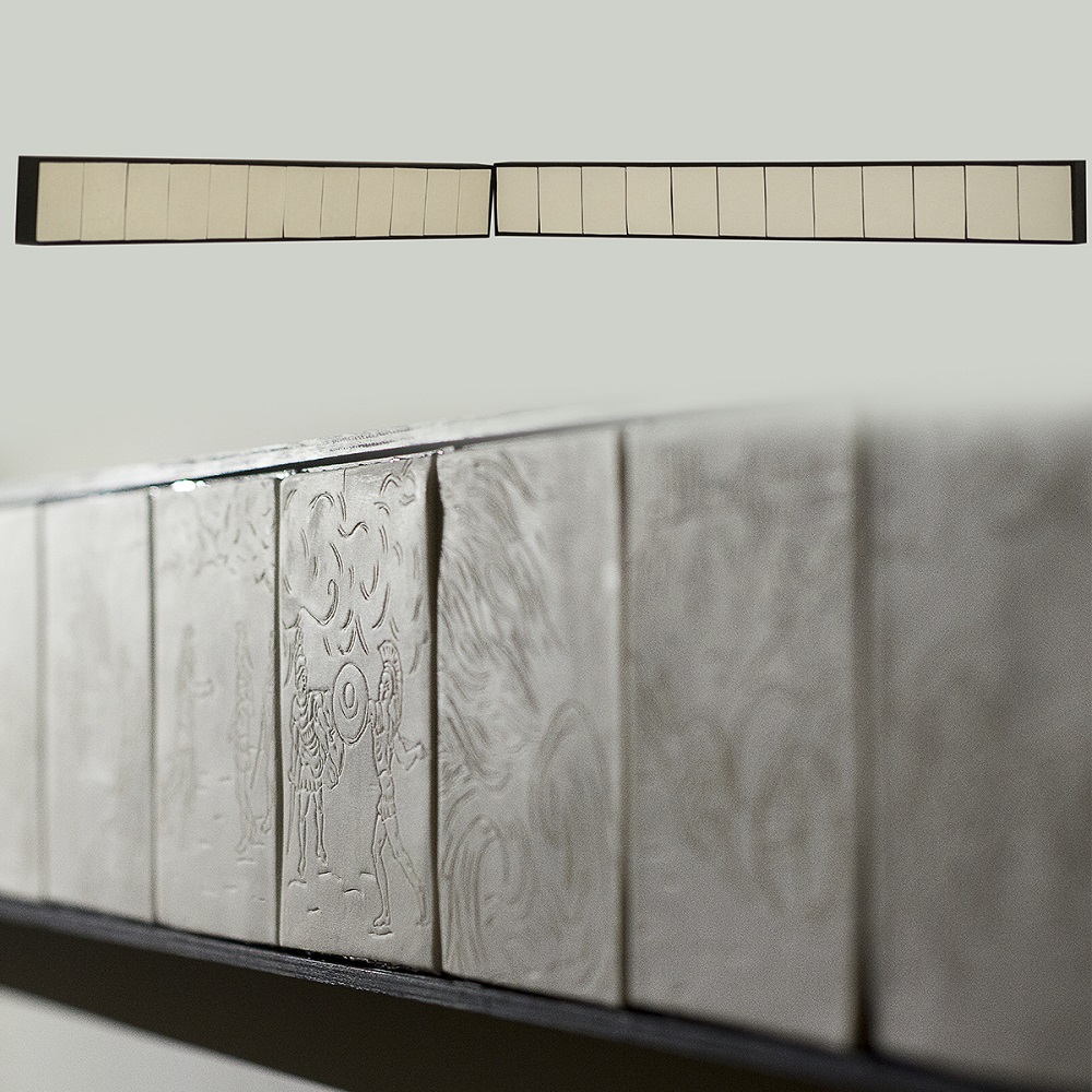 Troya Savaşı’nın dokuzuncu yılından elli bir günlük bir dönemi anlatan ve on beş bin dizeden oluşan İlyada destanı 24 bölümden oluşur. İlyada Destanı’ndan esinlenerek üretilen bu çalışma, efsaneye dair betimlenen anlatıların 24 karede yorumlanmasını içerir. Tanrıların ve kralların bu savaşına dair imgelerin porselen üzerine kazıma tekniği ile işlendiği sahneler ışık ile birlikte bir tür film şeridine dönüşür. Çalışma, epik destan İlyada’nın görsel ve sinematografik bir kurgusunu izleyiciye sunar.
